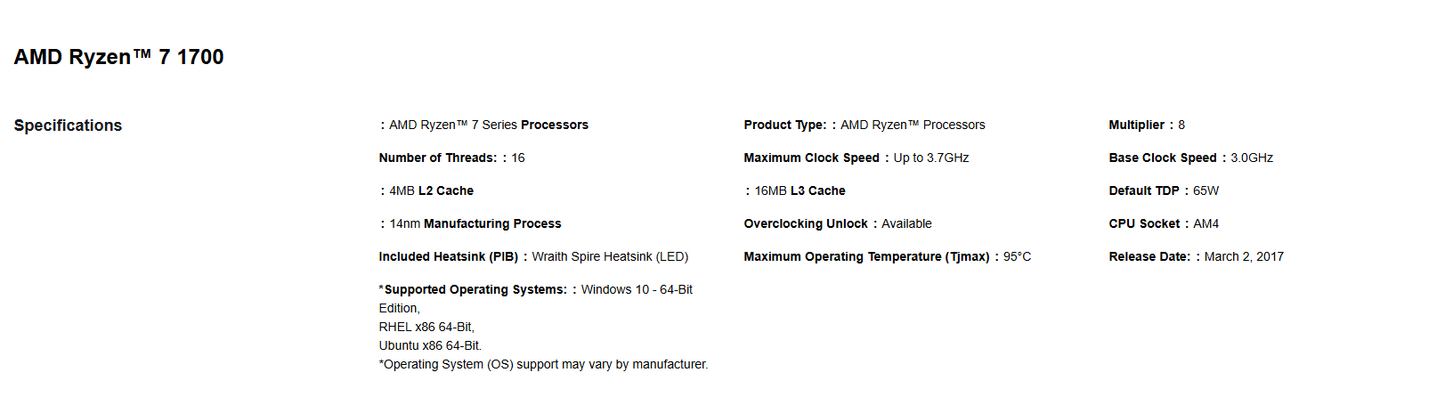 AMD RYZEN 7 1700 8-Core 16-Thread up to 3.7GHz With Wraith Spire Cooler AM4 Desktop Processor