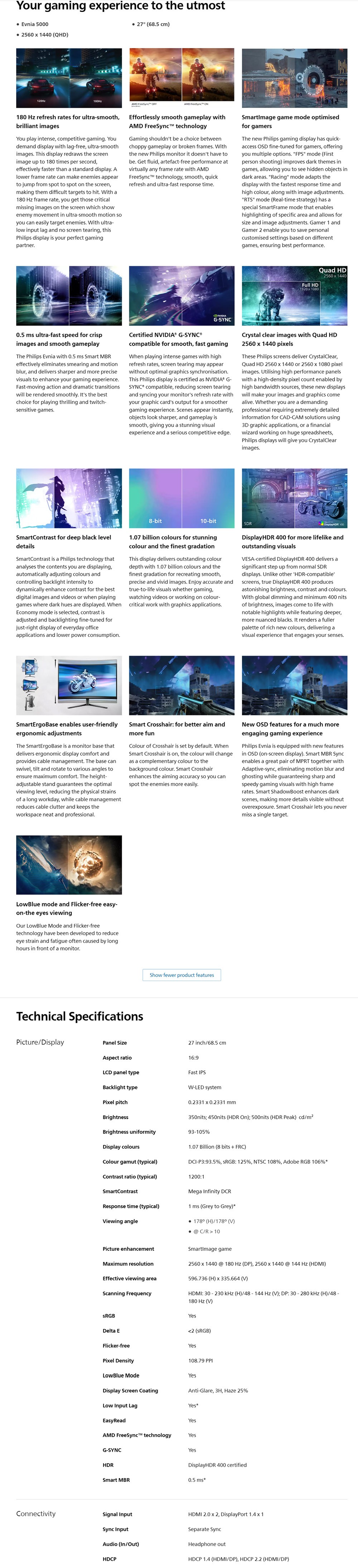 Philips Evnia 27M2N5500Q 27-Inch QHD IPS 200Hz HDR400 0.3ms FreeSync Gaming Monitor