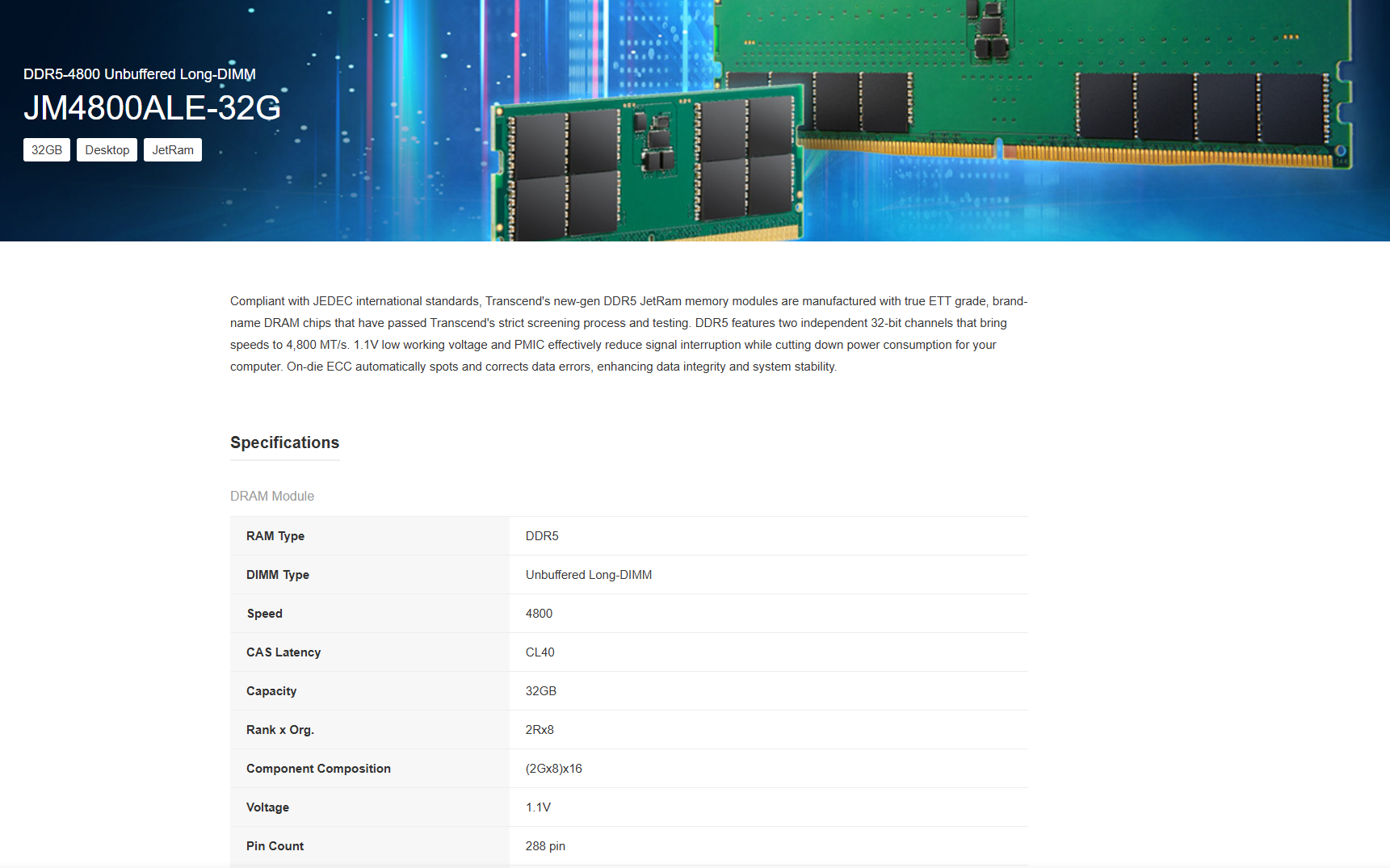 Transcend 32GB 4800MHz DDR5 UDIMM RAM Desktop Memory